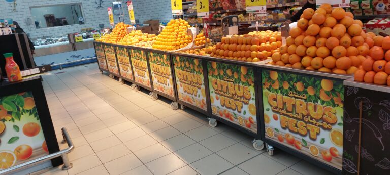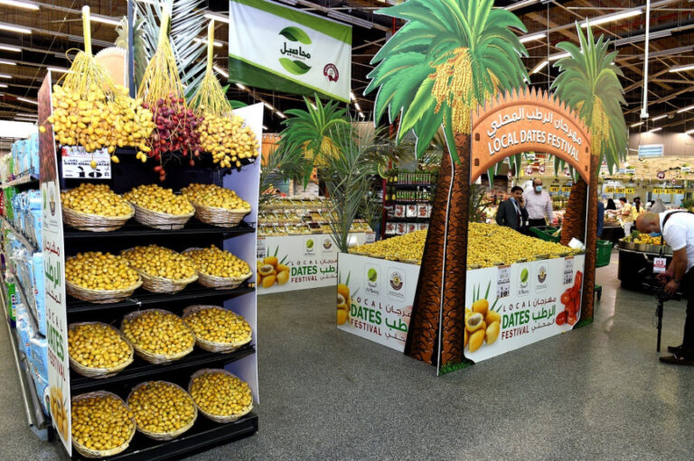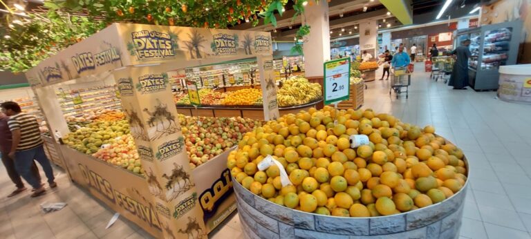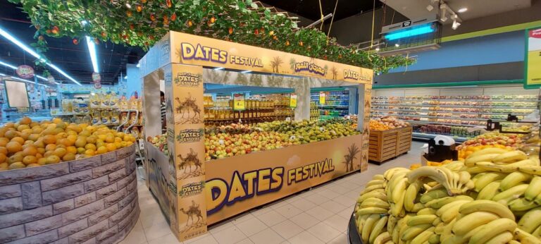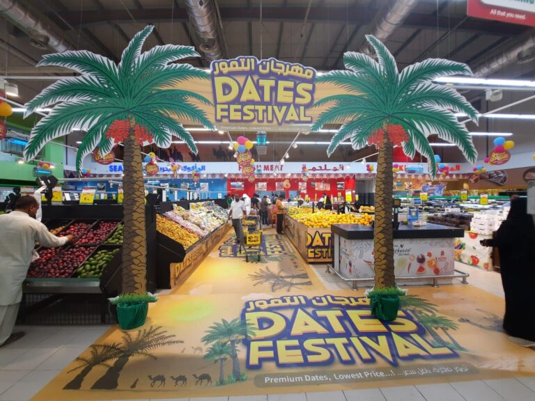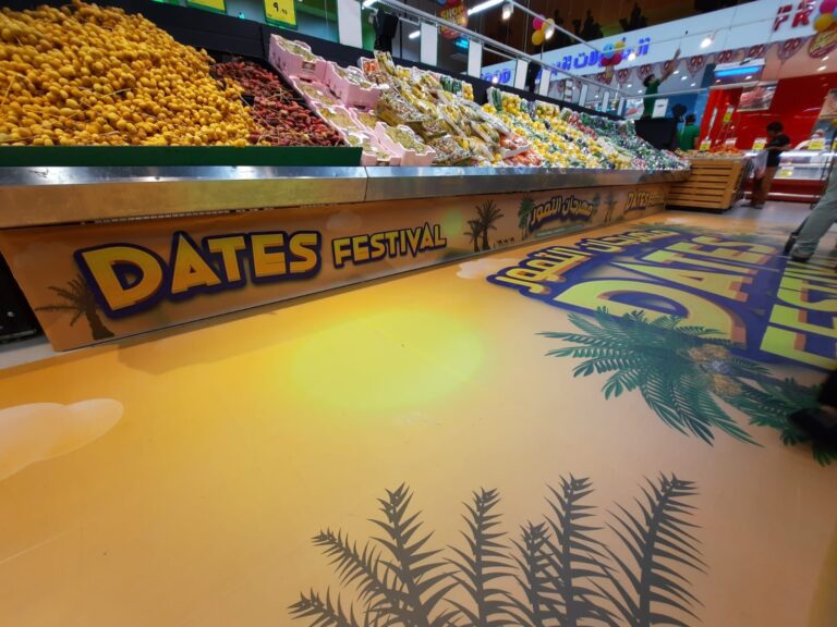 In preparation for the upcoming Dates Festival at the hypermarket, we have meticulously designed and arranged branded stalls adorned with vibrant palm dates graphics to create a visually appealing and thematic shopping experience. The setup includes an array of decorative palm trees strategically placed to evoke the essence of an authentic oasis, perfectly complementing the festival’s theme.